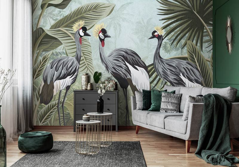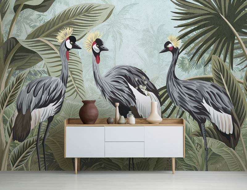 Bringen Sie die Mystik des Dschungels in Ihre Innenräume mit unserer Fototapete Kraniche im Dschungel. Diese bezaubernde Fototapete zeigt majestätische Kraniche inmitten von üppigem Grün und schafft in jedem Raum eine Atmosphäre von Abenteuer und natürlicher Schönheit.