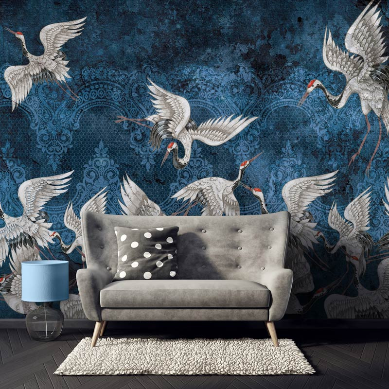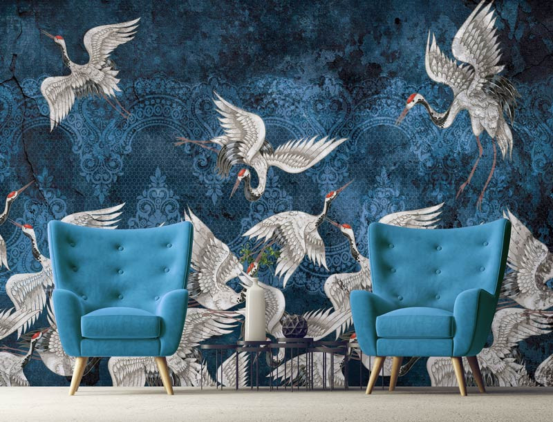 Fototapete mit prächtigen Kranichen, dargestellt auf einem abstrakten, blauen und künstlerischen Hintergrund.