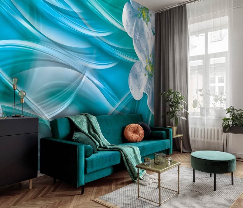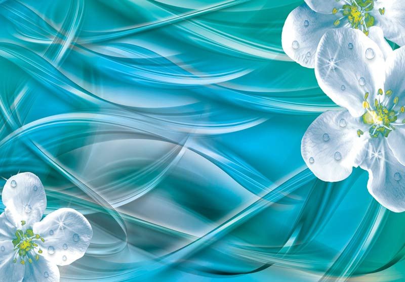Vliestapete mit schimmernden Blumen auf einem wellenförmigen, malerischen, abstrakten Kunstwerk.