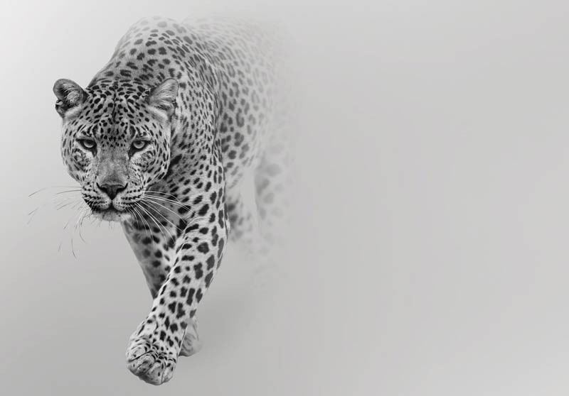 Fototapete eines atemberaubenden Leoparden, dargestellt in Schwarz und Weiß.