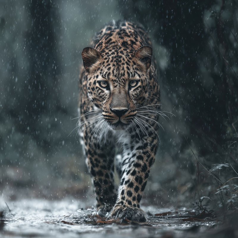 Holen Sie sich die Aufregung und Schönheit des Dschungels mit dieser beeindruckenden Fototapete nach Hause. Das Design zeigt einen kräftigen Leoparden, der durch den tropischen Regenwald streift, während Regentropfen niedergehen. Der intensive Blick und die realistischen Details sorgen für einen lebensechten Look, der jeden Raum verwandelt.