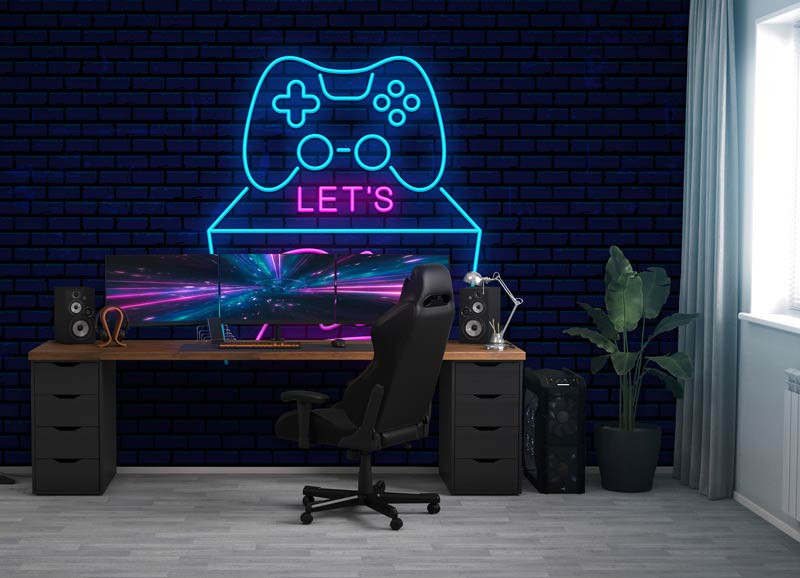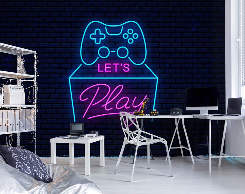 Verleihen Sie Ihrem Spielzimmer einen energiegeladenen und modernen Look mit der Fototapete Let's Play Gaming Neon. Dieses auffällige Design zeigt einen neonfarbenen Spielcontroller in leuchtend blauen Linien, kombiniert mit dem Text "Let's Play" in leuchtendem Neonpink. Der dunkle Backsteinhintergrund sorgt für einen zusätzlichen Kontrast, der die Neonfarben noch mehr hervorhebt und die Atmosphäre eines echten Gamer Rooms verstärkt.