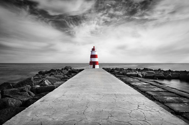 Lassen Sie sich von der Küstenschönheit der Fototapete Leuchtturm am Strand von Praia Da Rocha an der Algarve verzaubern. Erleben Sie die ruhige Schönheit des Strandes und den ikonischen Leuchtturm, der den Horizont ziert.