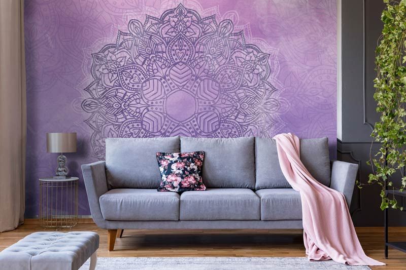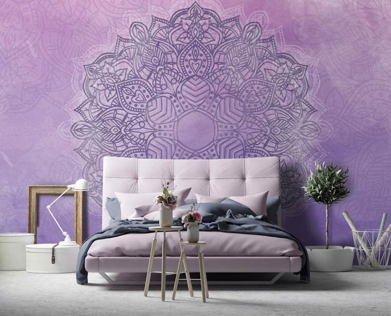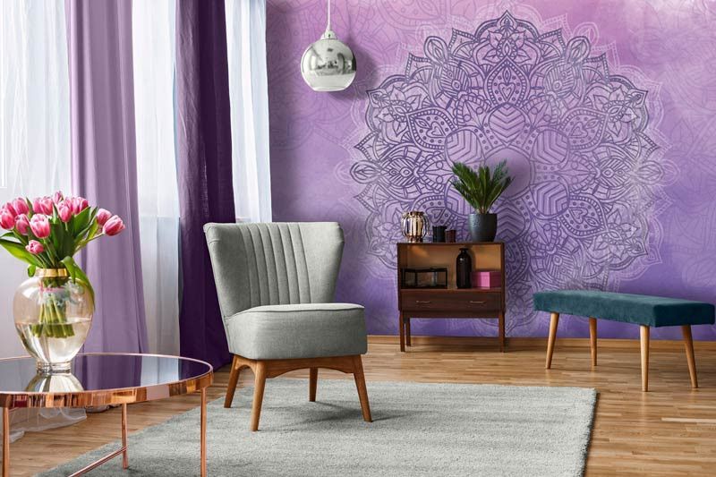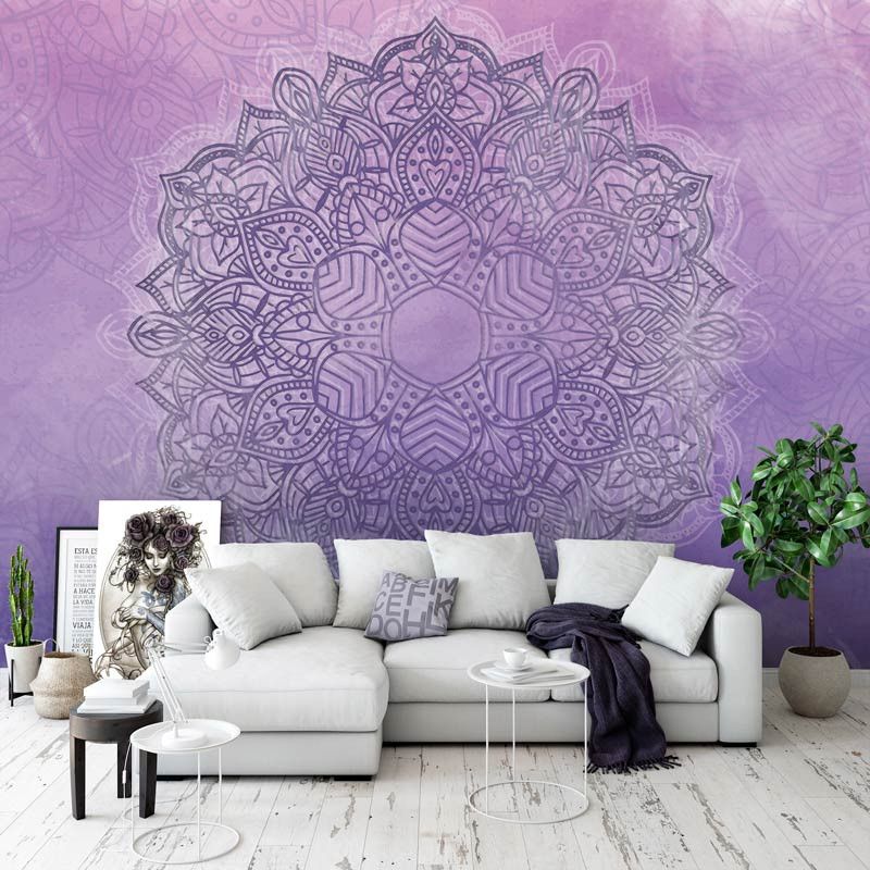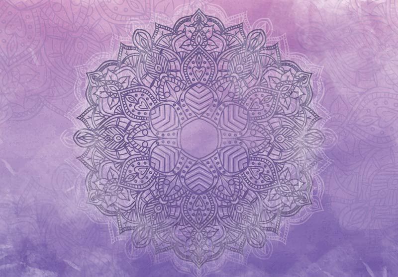 Vliestapete mit einem schönen lila Mandala, das auf einem abstrakten violetten Hintergrund dargestellt ist. Mandalas sind schillernde kreisförmige Figuren mit symmetrischen Elementen.