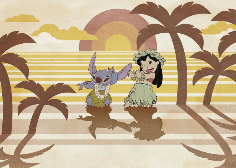 Lassen Sie sich an einen tropischen Strand entführen mit dieser stimmungsvollen Fototapete von Lilo und Stitch beim Hula-Tanz im Sonnenuntergang. Die warmen Gelb-, Braun- und Beigetöne schaffen eine entspannte und nostalgische Ausstrahlung mit einem Hauch von Vintage-Charme. Grafische Palmen und sanfte Farben verstärken das Urlaubsgefühl und machen diese Tapete zu einem echten Blickfang. Ideal für das Kinderzimmer oder jeden Raum, in dem Fröhlichkeit und eine entspannte Atmosphäre im Mittelpunkt stehen.