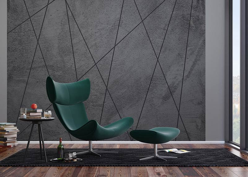 Diese moderne Fototapete mit klaren Linien auf einem Betonhintergrund bringt ein minimalistisches, industrielles Gefühl in jeden Raum. Die grauen Betontöne und die kontrastierenden Linien vermitteln ein Gefühl von Tiefe und Raffinesse, was ideal für moderne Innenräume ist.