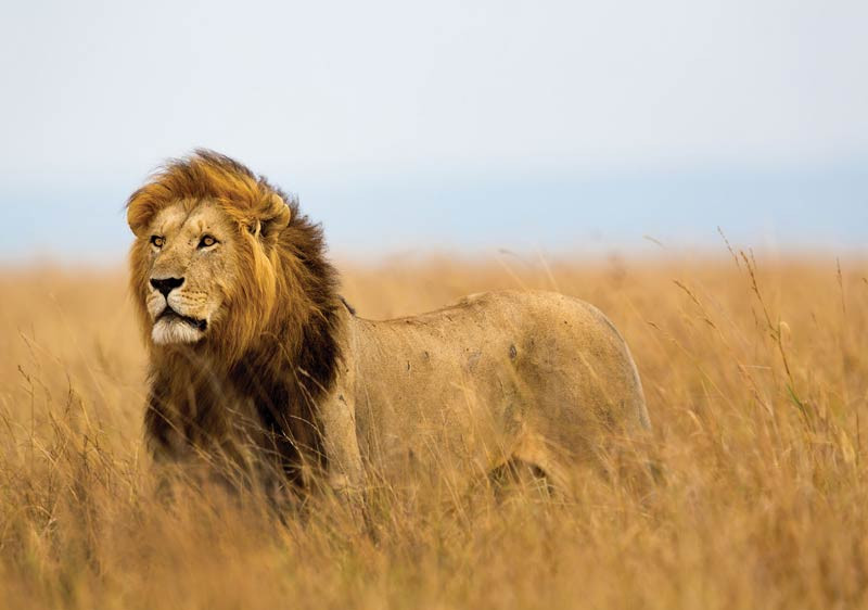 Fototapete eines imposanten Löwen, der auf dem Feld posiert. Der König der Tiere ist etwa 2 Meter lang und kann bis zu 200 Kilo wiegen.