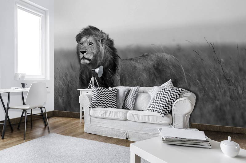 Die schwarz-weiße Fototapete mit dem Löwen ist ein echter Hingucker und passt in jedes Zimmer.