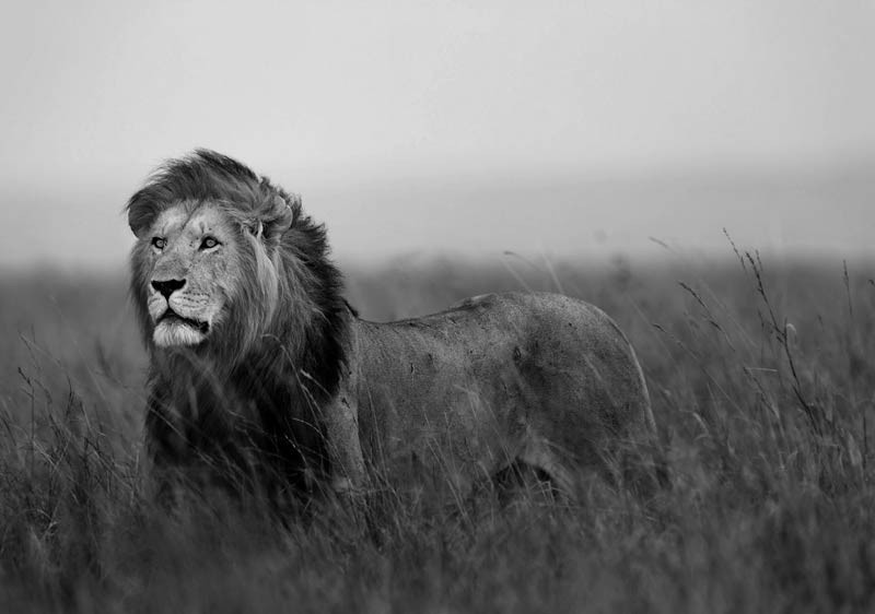 Fototapete eines imposanten Löwen, der auf dem Feld posiert, in schwarz-weiß. Der König der Tiere ist etwa 2 Meter lang und kann bis zu 200 Kilo wiegen.