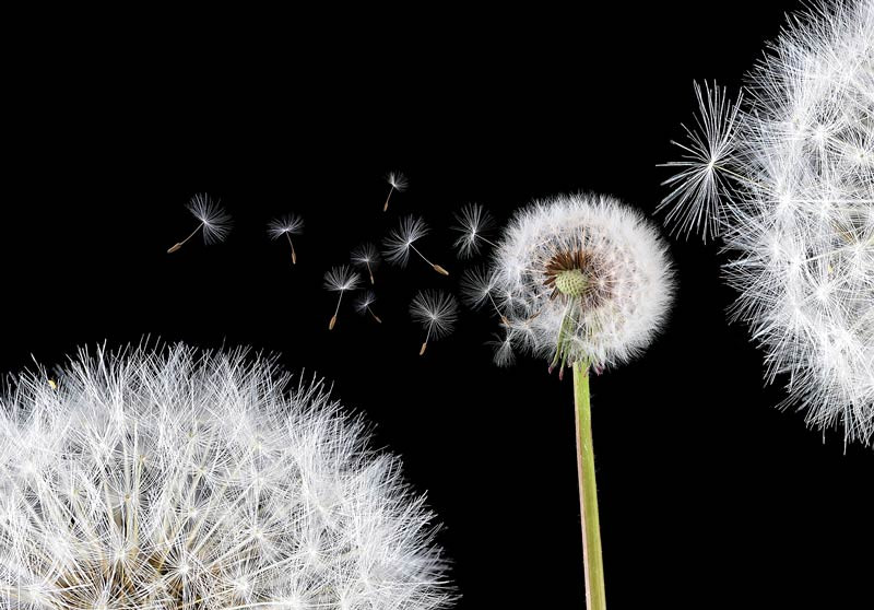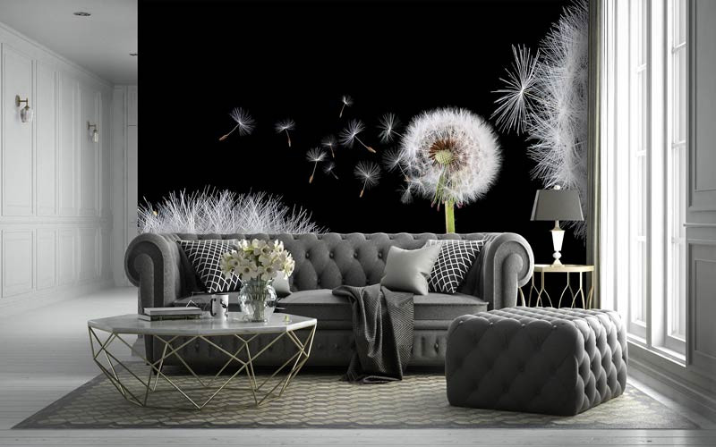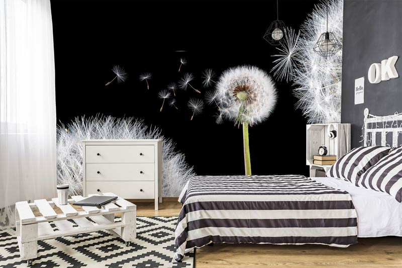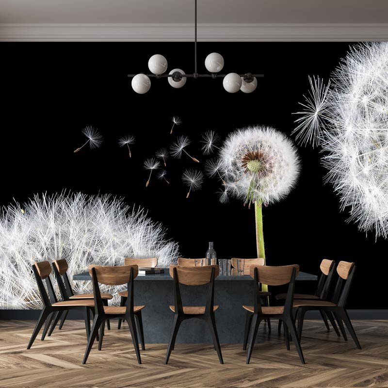 Vlies Fototapete von Löwenzahn auf einem schwarzen Hintergrund angezeigt.