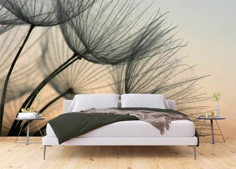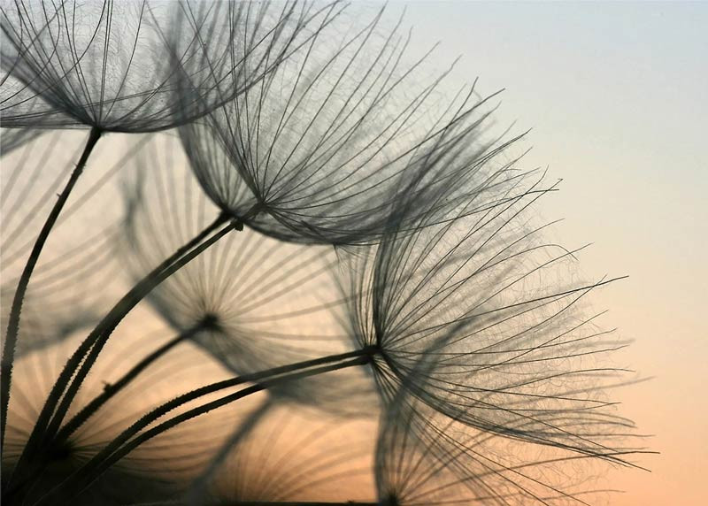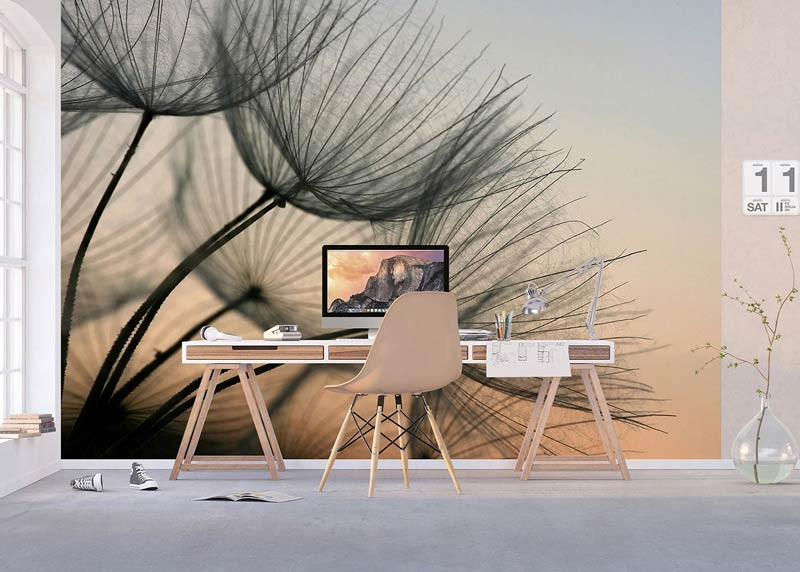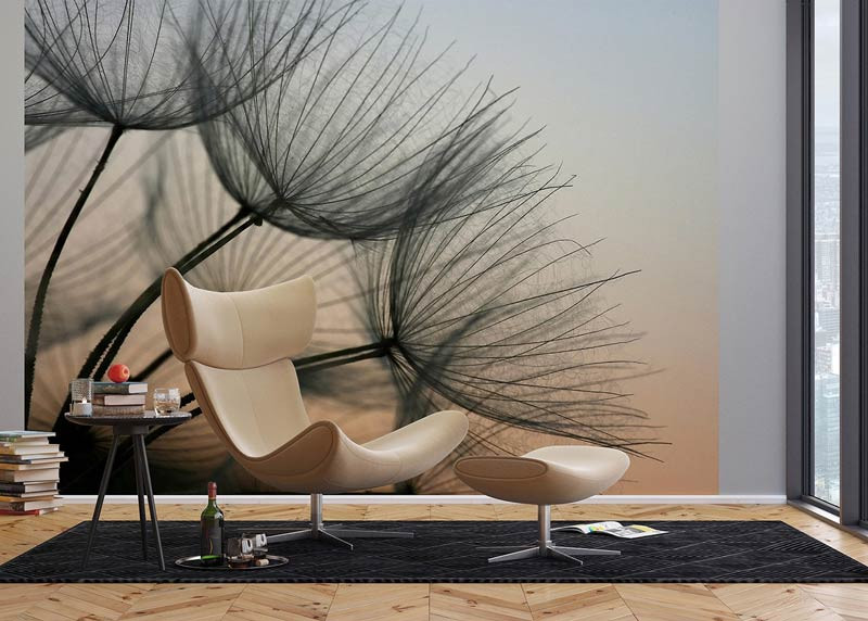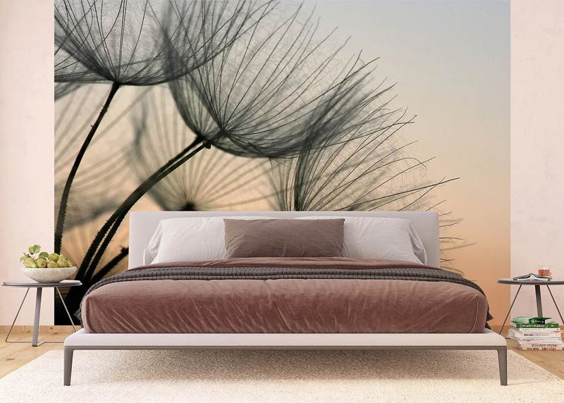 Erleben Sie mit dieser Fototapete die zarte Schönheit einer Pusteblume, die sanft vom Abendlicht beleuchtet wird. Die subtilen Farben und feinen Details des Samenflaums sorgen für eine ruhige und heitere Atmosphäre.