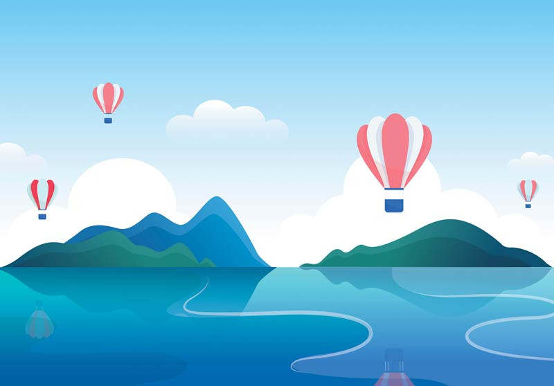 Über dem Meer und den Bergen fliegen 4 rote Heißluftballons.