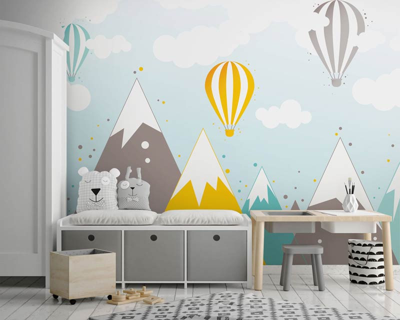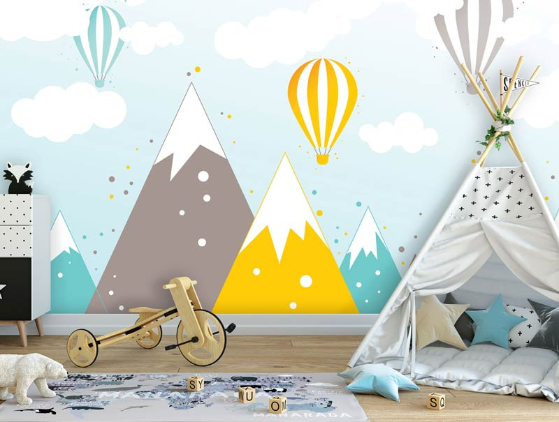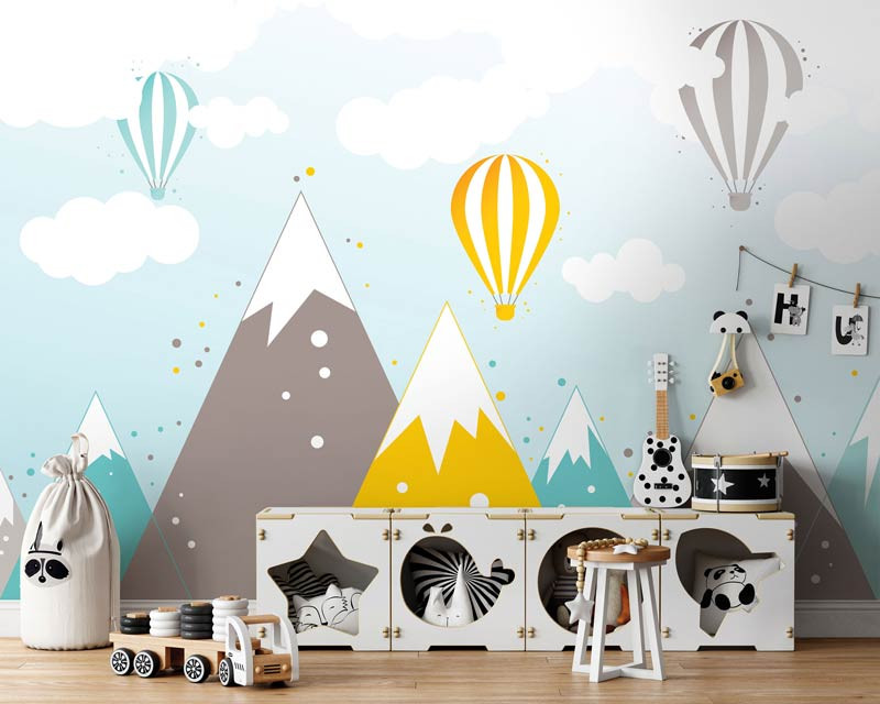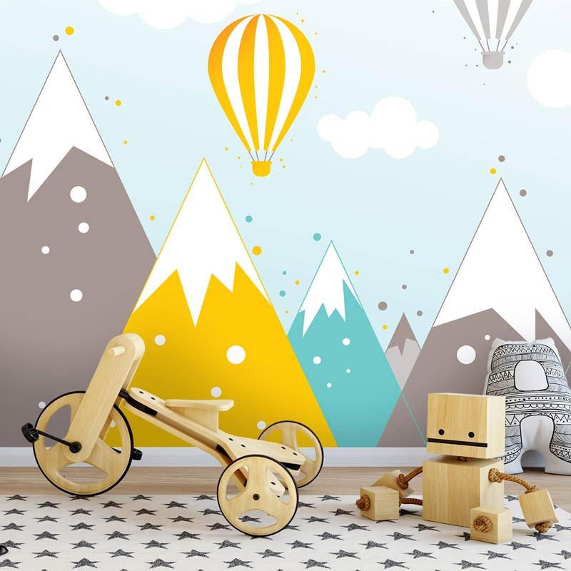 Fototapete für die Kleinen. Bunte Heißluftballons über schneebedeckten Berggipfeln. Diese Fototapete ist ein Blickfang in jedem Babyzimmer und Kinderzimmer.