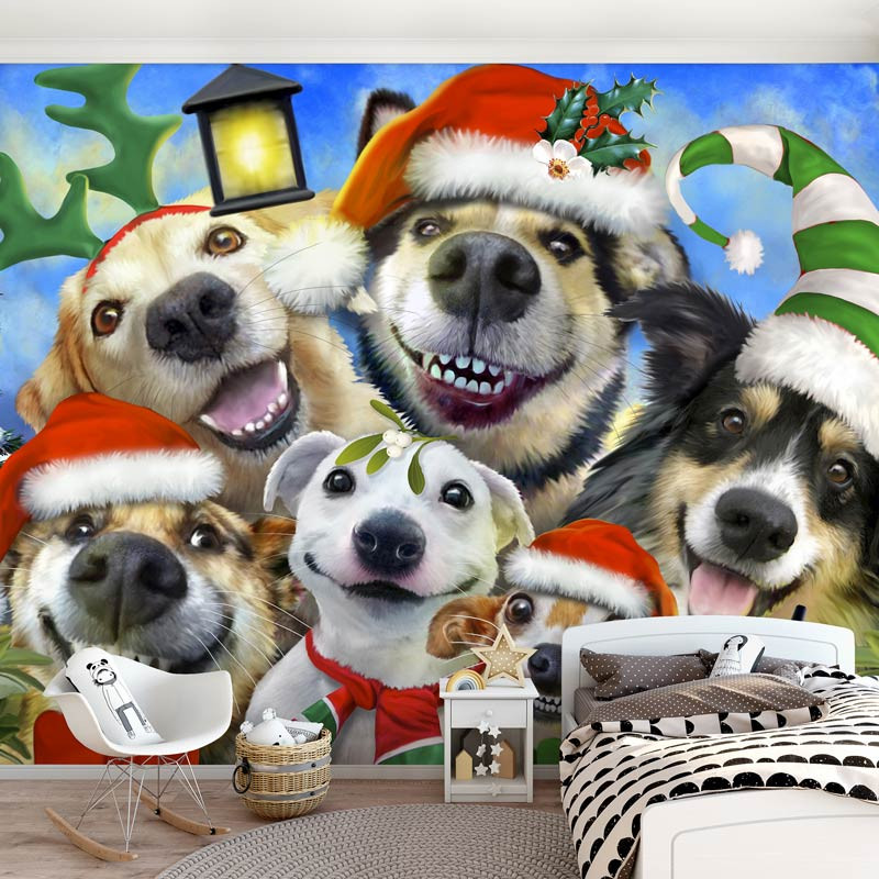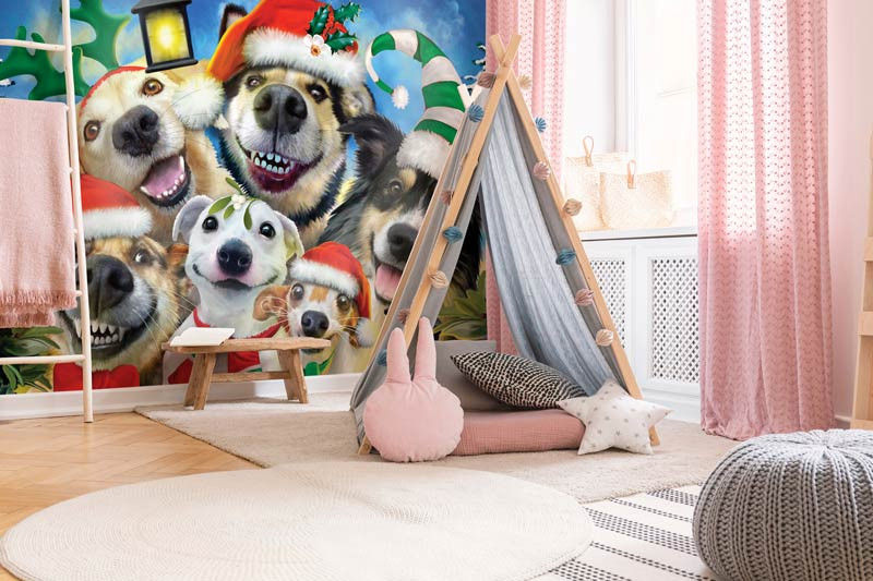 Vlies-Fototapete von tollwütigen Hunden, die zusammen ein tolles Bild ergeben! Ein Must-Have für jedes Kinderzimmer.