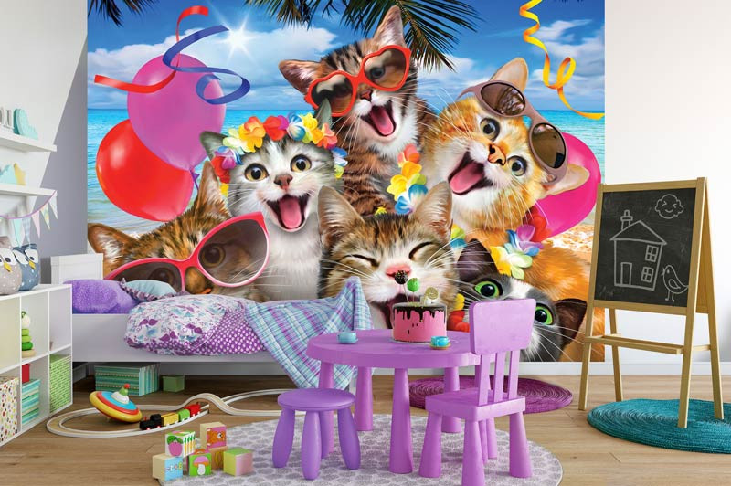 Vlies-Fototapete mit albernen Katzen, die extra für Ihr Kind ihre Partykleidung angezogen und ein tolles Bild gemacht haben! Ein Muss für das Zimmer Ihres Kindes.