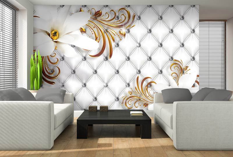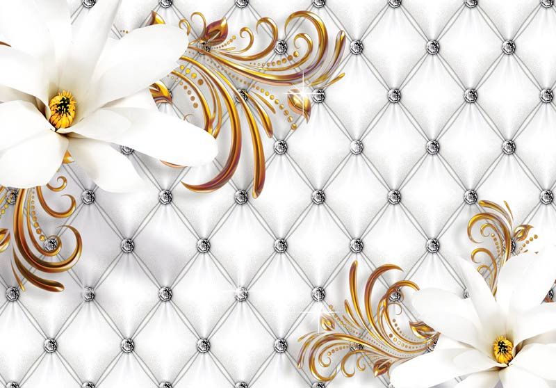 Vlies Fototapete mit einem schönen, silbernen und goldenen Muster, kombiniert mit schönen, weißen Blumen.