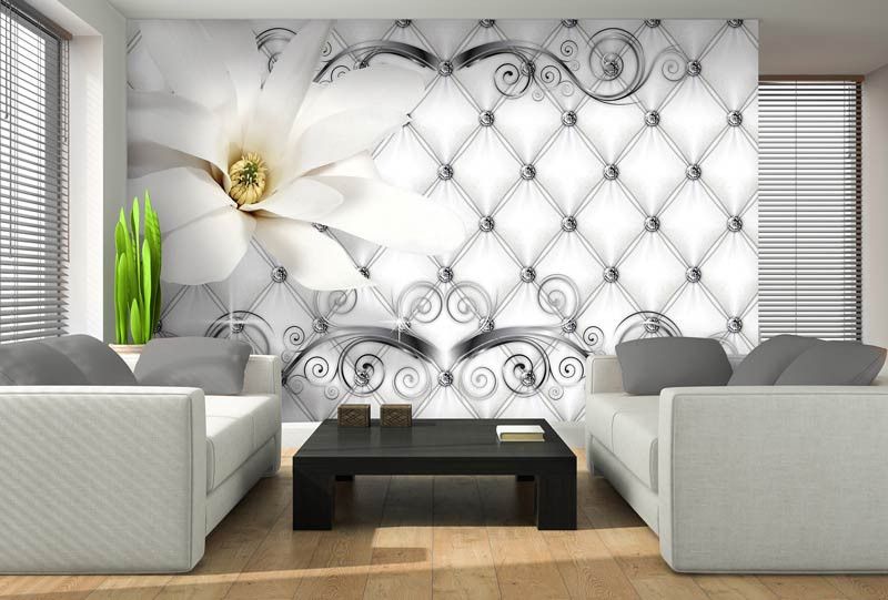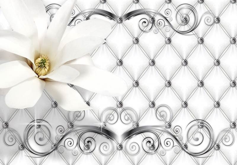 Vlies Fototapete mit einem schönen, silbernen Muster, kombiniert mit einer schönen, weißen Blume.