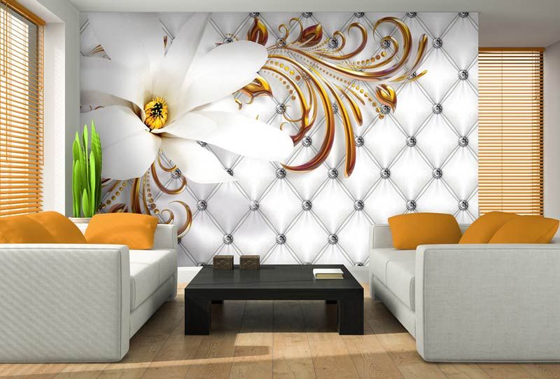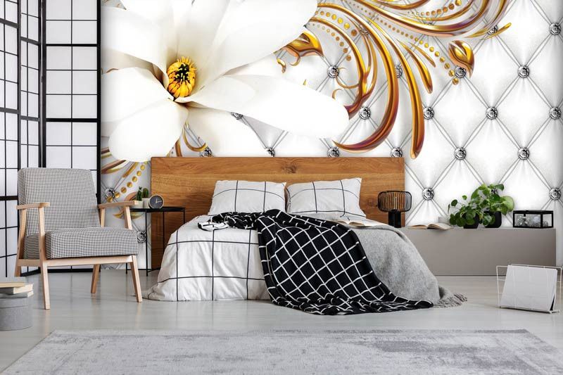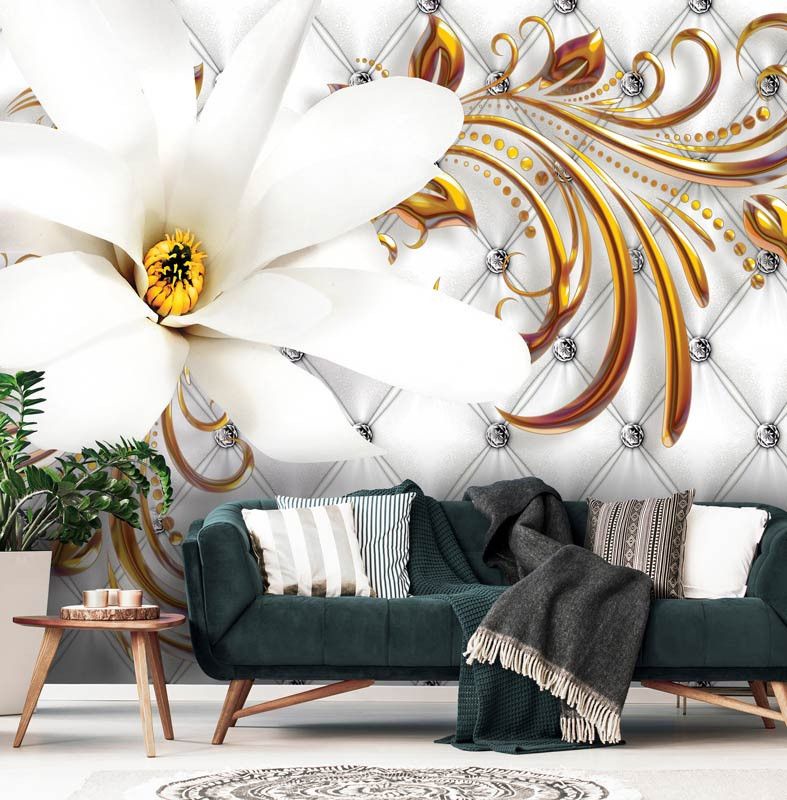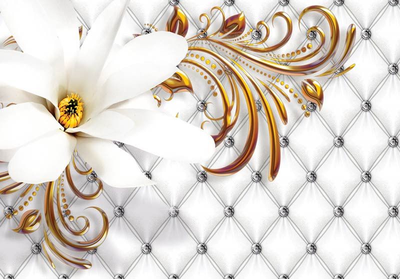 Vlies Fototapete mit einem schönen, silbernen und goldenen Muster, kombiniert mit einer schönen, weißen Blume.