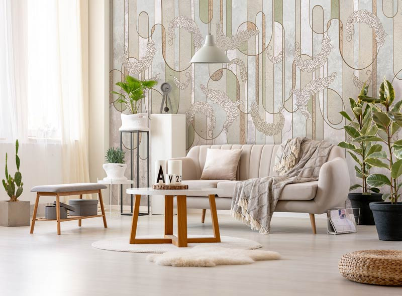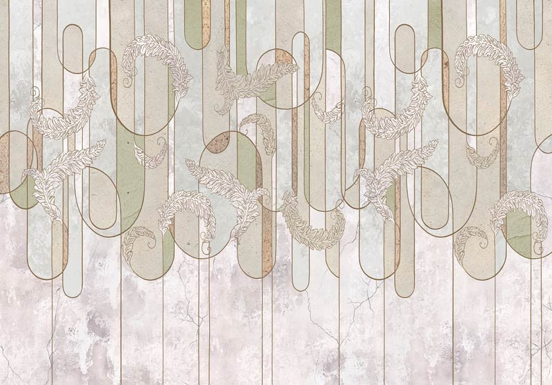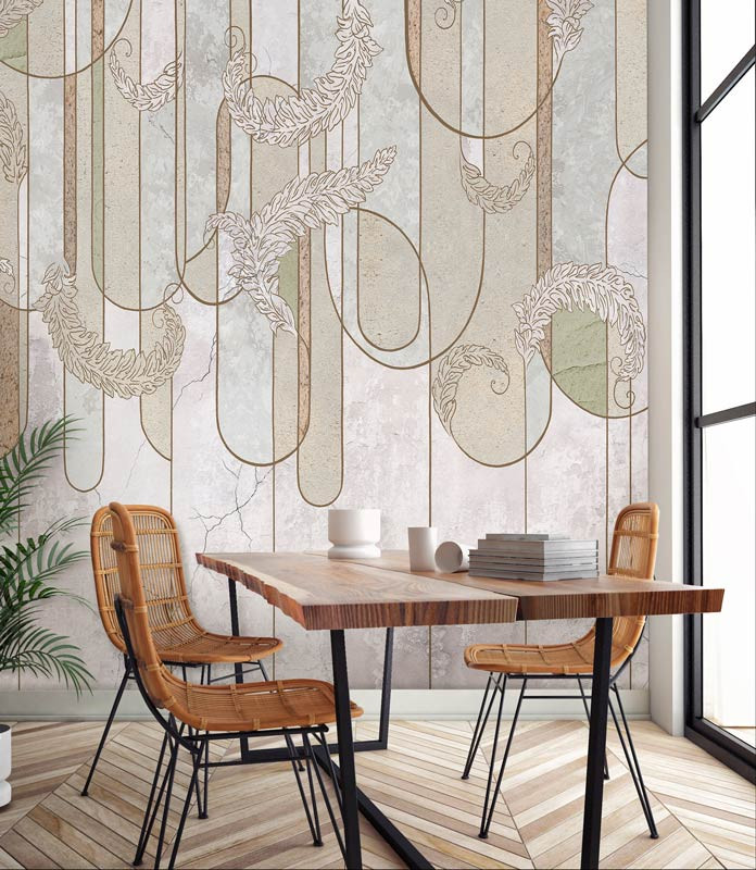 Abstrakte Fototapete einer Marmorwand mit verschiedenen Federn als Dekoration. Die Fototapete Marmor ist heutzutage sehr beliebt, da sie von echtem Marmor kaum zu unterscheiden ist.