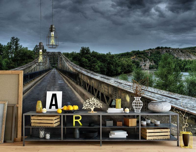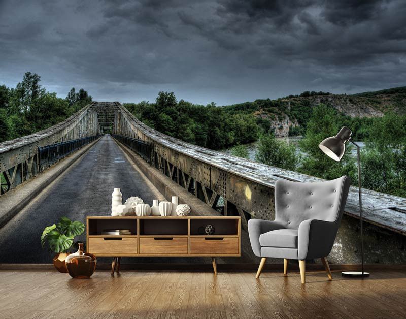 Wallpaper einer alten, industriellen Stahlbrücke, hoch oben in den Bergen. Wenn Sie in die Tiefe schauen, entsteht ein toller 3D-Effekt.