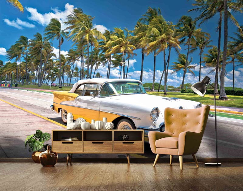 Bringen Sie Sonnenschein, Retro-Stil und einen Hauch von Urlaubsstimmung in Ihr Zuhause mit dieser Fototapete Miami Vibes. Ein klassischer gelb-weißer Oldtimer parkt entlang eines tropischen Boulevards voller sich wiegender Palmen unter einem strahlend blauen Himmel. Die leuchtenden Farben und die sonnige Atmosphäre bringen sofort ein sommerliches Gefühl in jeden Raum.