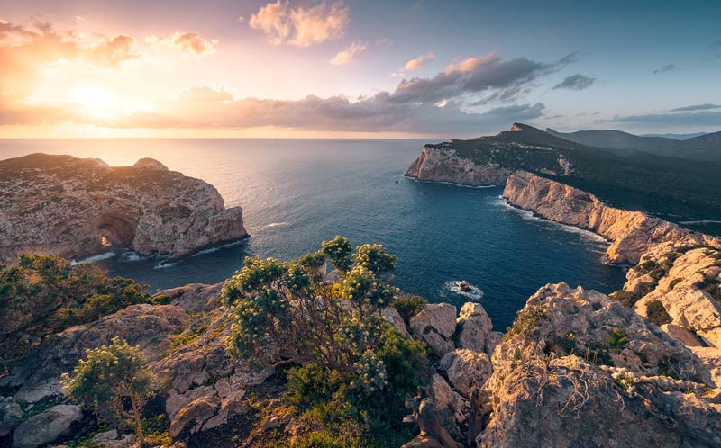 Capo Caccia bietet ein spektakuläres Bild: Die weißen Kalksteinfelsen der Halbinsel Piana umrahmen das türkisblaue Mittelmeer.