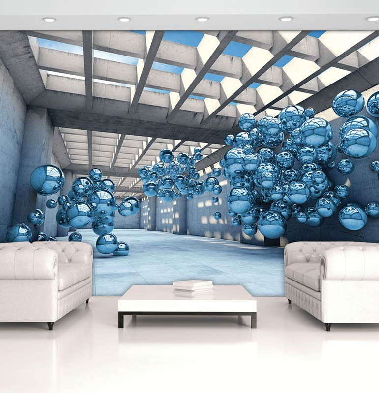 Vlies Fototapete von blauen Metallkugeln in einem abstrakten 3D Raum.