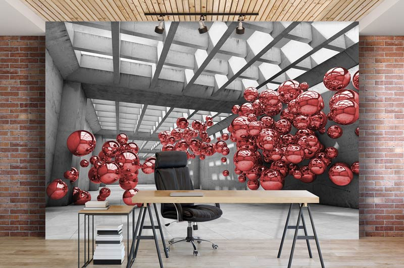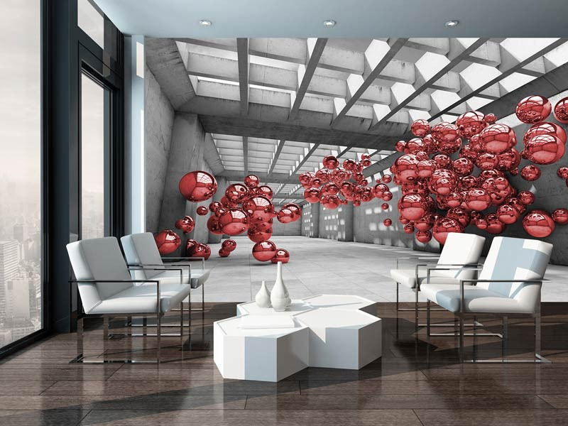 Vlies Fototapete von roten Metallkugeln in einem abstrakten 3D-Raum.