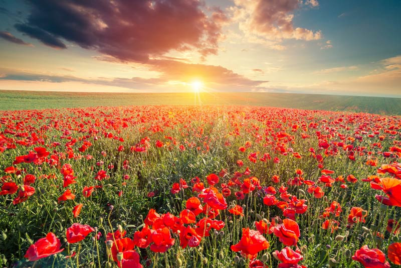 Erleben Sie die bezaubernde Pracht von Mohnblumen im warmen Licht des Sonnenuntergangs mit unserer Fototapete mit Mohnblumen. Holen Sie sich die Ruhe und Gelassenheit dieses magischen Moments in Ihr Interieur und genießen Sie die beruhigende Atmosphäre, die er schafft.