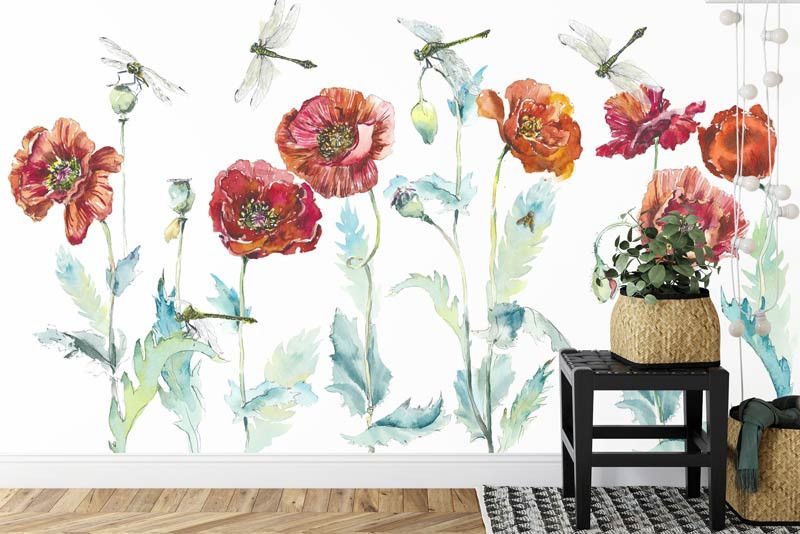 Mit unserer Fototapete können Sie ganz einfach die Maße bestellen, die perfekt in Ihren Raum passen. Lassen Sie die leuchtenden roten, orangen und gelben Farben der Mohnblumen Ihr Interieur verschönern und einen Hauch von natürlicher Fröhlichkeit hinzufügen.