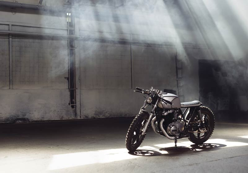 Fototapete eines schönen Motorrads unter dem Rauch eines Industriegebäudes.
