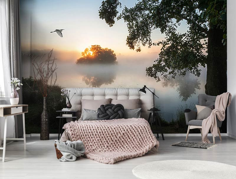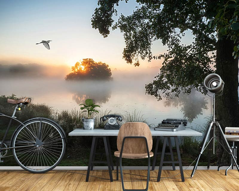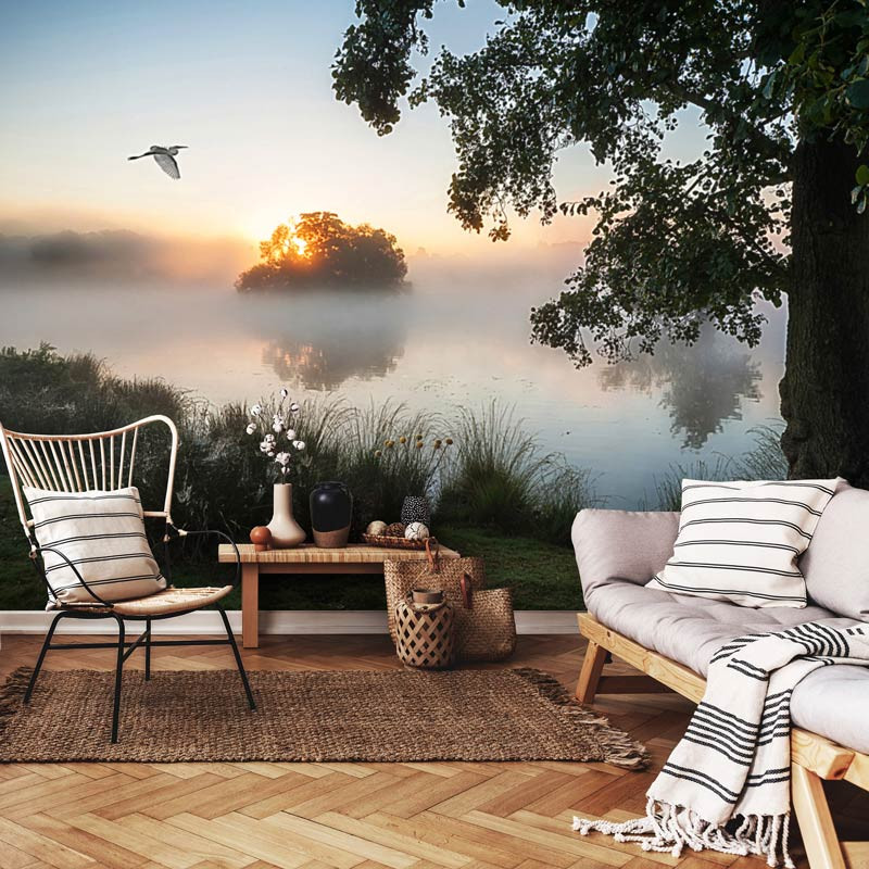 Bringen Sie die beruhigende Atmosphäre der Natur in Ihr Zuhause mit dieser schönen Fototapete, die eine neblige Landschaft und einen See zeigt. Die Tapete zeigt eine ruhige Umgebung, in der sich der Nebel langsam lichtet und der See sanft plätschert. Es ist, als ob Sie von Ihrem eigenen Zuhause aus auf eine idyllische Landschaft blicken würden.