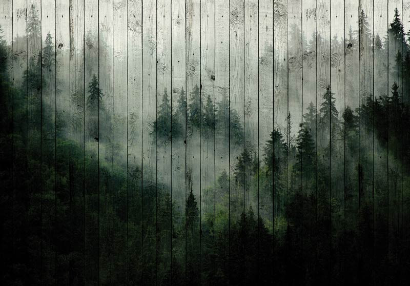 Fototapete eines schönen nebligen Waldes auf Holzbrettern.