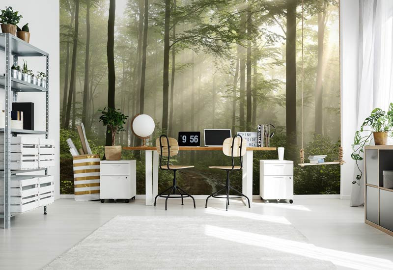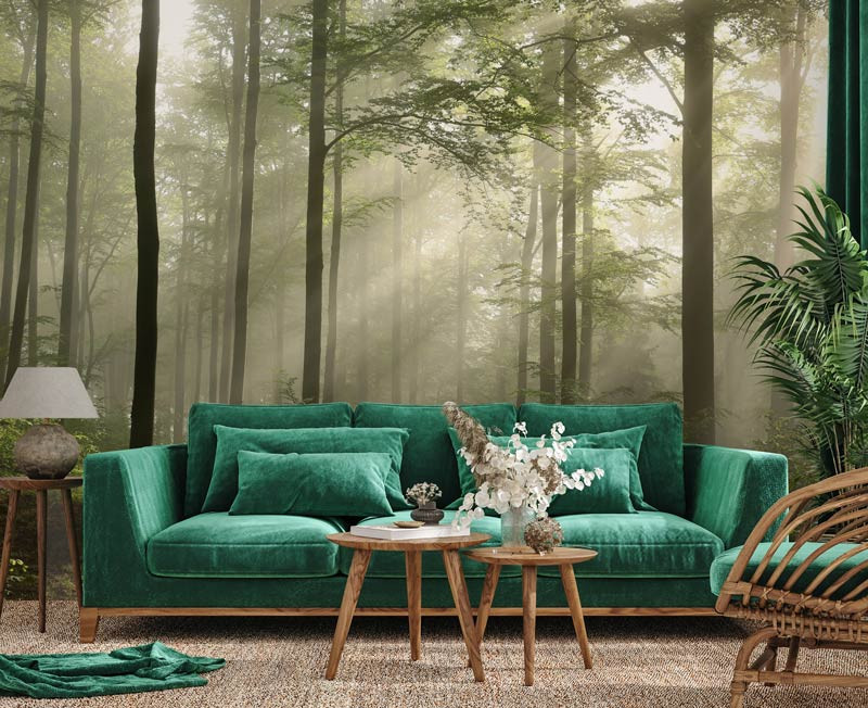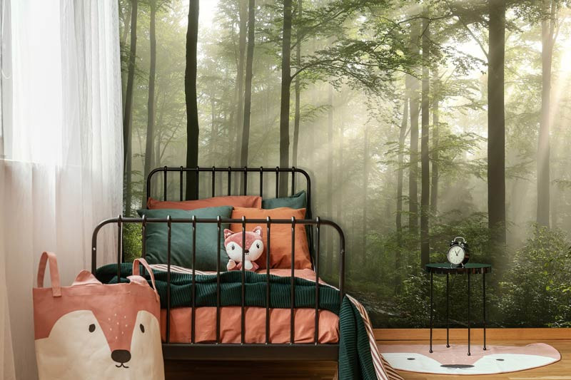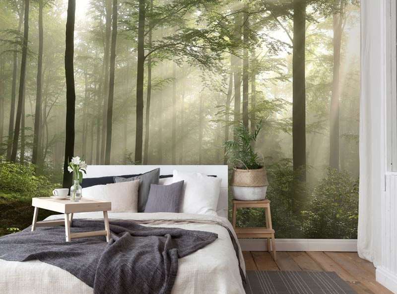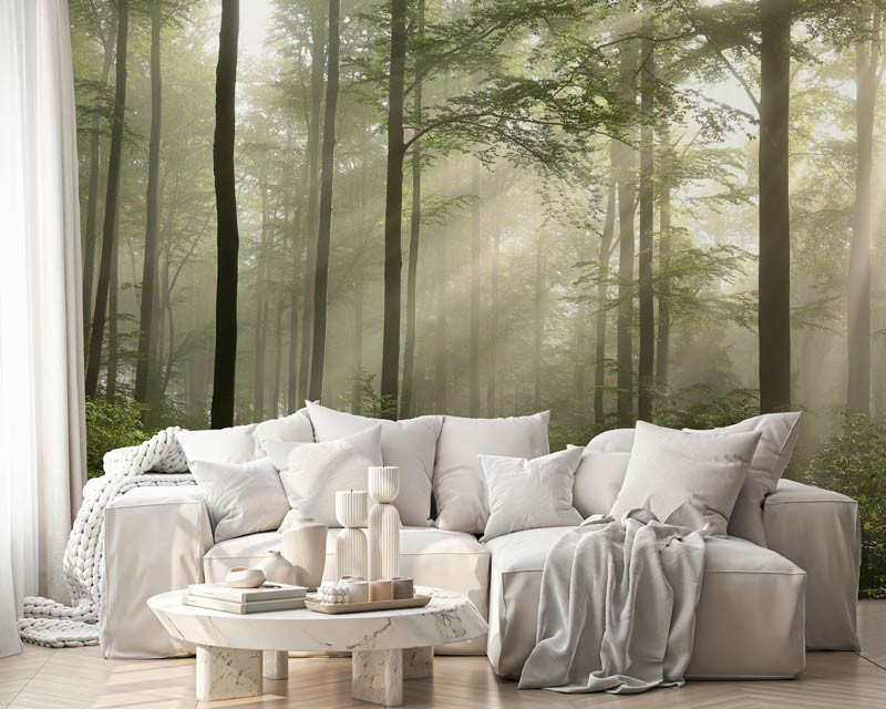 Die subtilen Farben und feinen Details verleihen der Tapete eine natürliche Tiefe und beruhigende Wirkung. Die Kombination aus Morgennebel und Sonnenstrahlen schafft ein magisches Walderlebnis, das in jedem Raum einen harmonischen Look erzeugt.