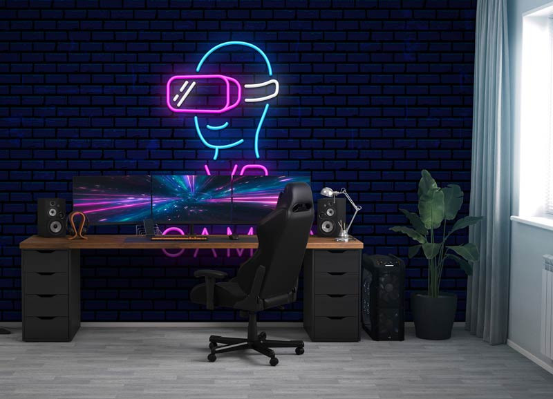 Bringen Sie die Energie und Aufregung der virtuellen Realität in Ihr Spielzimmer mit der auffälligen Fototapete Neon VR Games. Dieses futuristische Design zeigt ein elegantes VR-Headset in leuchtenden Neonfarben, eingerahmt von einem dunklen Backsteinhintergrund für maximalen Kontrast. Die leuchtend pinken und blauen Linien erzeugen einen dynamischen und modernen Effekt, der sofort die Atmosphäre eines echten Gamer Rooms heraufbeschwört.