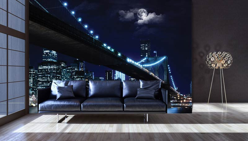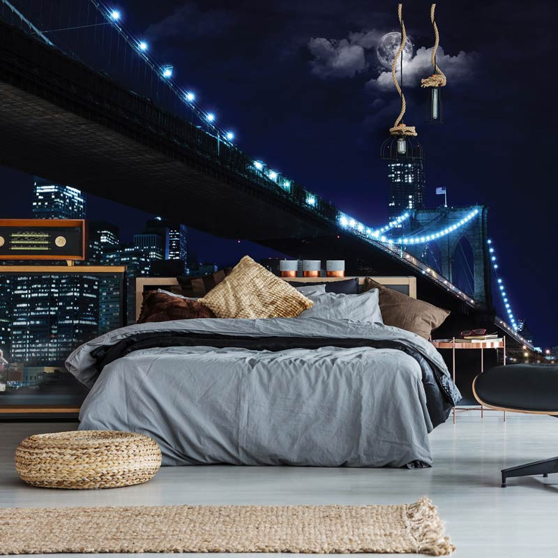 Vlies Fototapete der Brooklyn Bridge, mit im Hintergrund die beleuchteten Wolkenkratzer der amerikanischen Metropole: New York.
