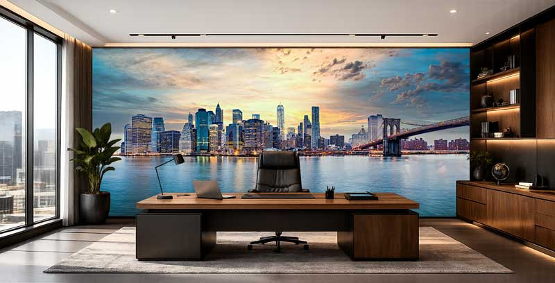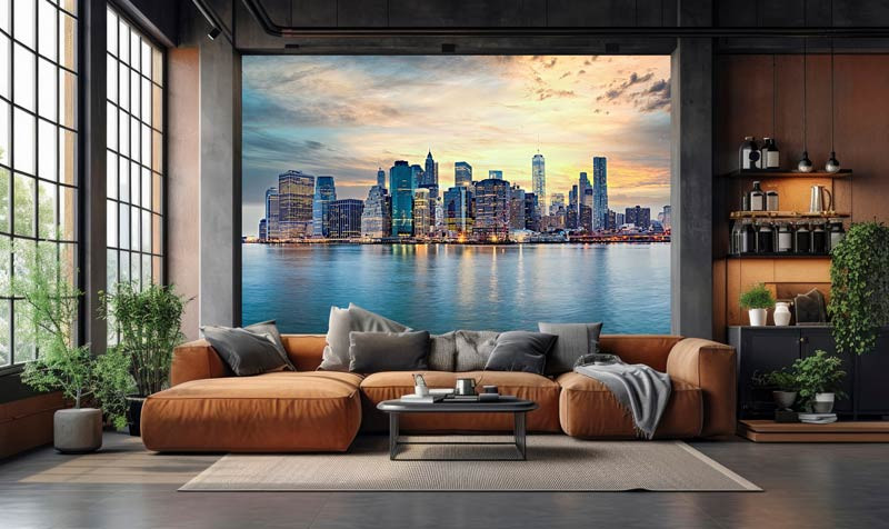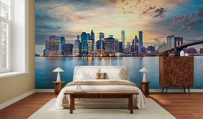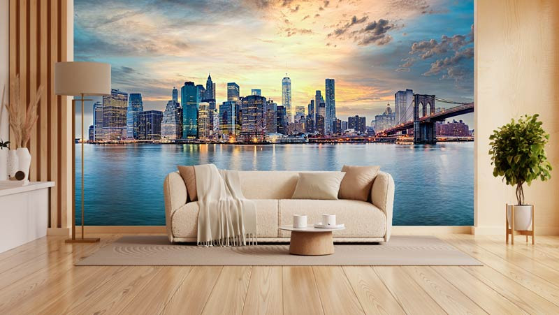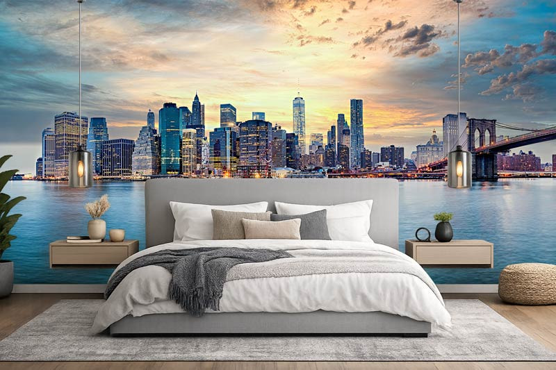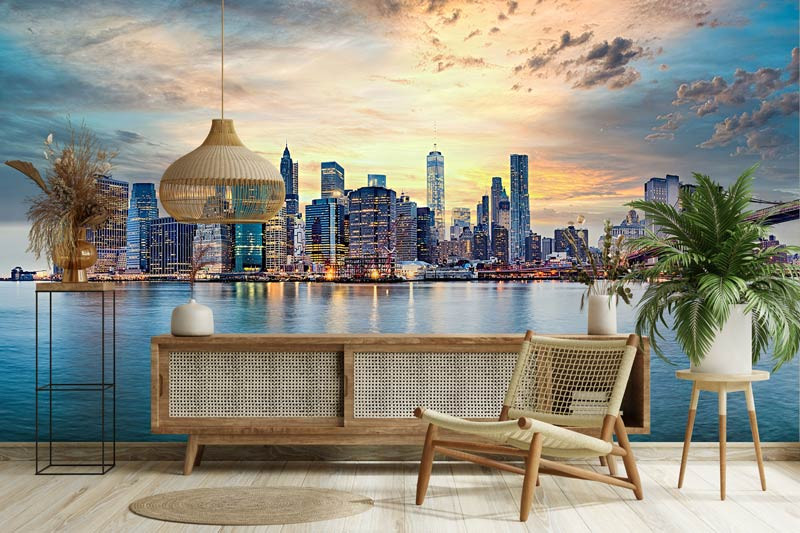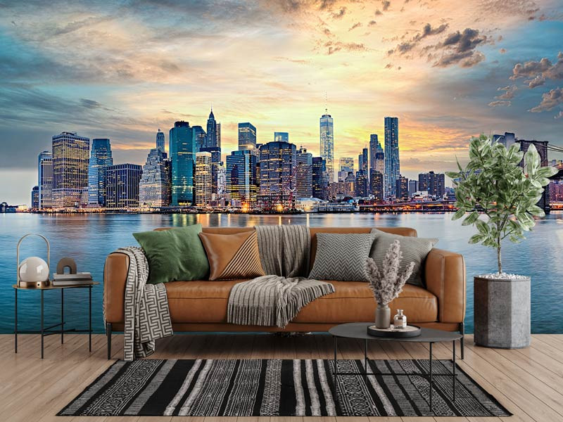 Diese beeindruckende Fototapete zeigt die ikonische Skyline von New York bei einem stimmungsvollen Sonnenuntergang. Die warmen orange- und goldfarbenen Töne am Himmel bilden einen wunderschönen Kontrast zu den kühlen blauen Spiegelungen im Wasser. Die bekannten Wolkenkratzer und die Brooklyn Bridge schaffen zusammen ein dynamisches und modernes Stadtbild mit einem eindrucksvollen Panoramaeffekt.