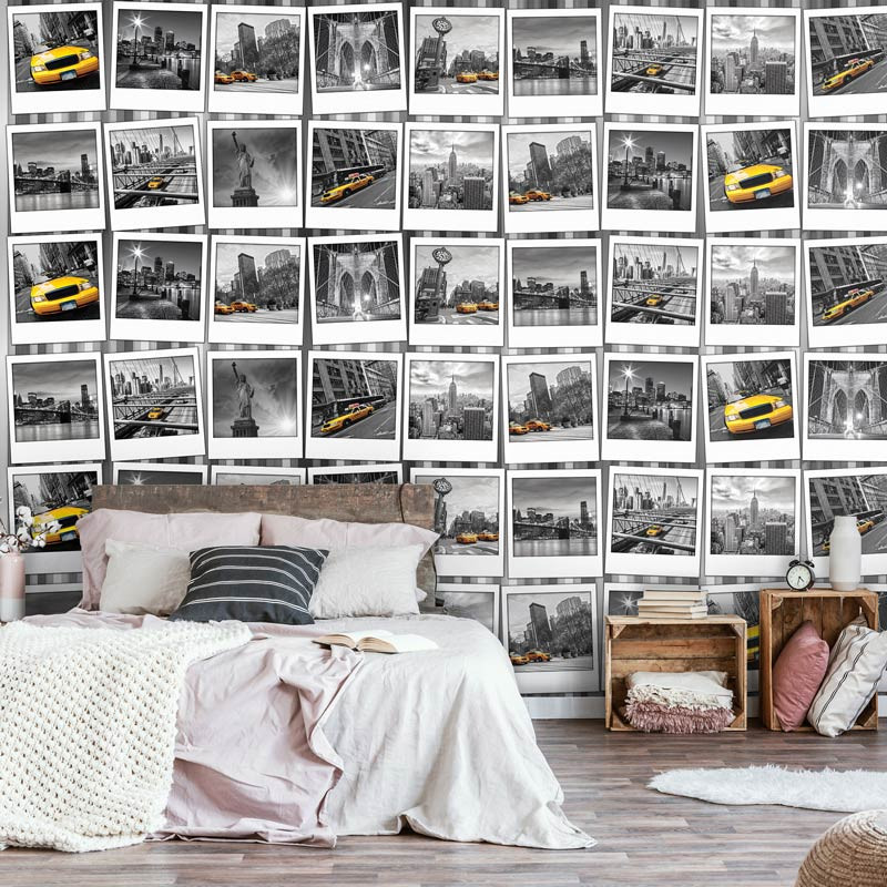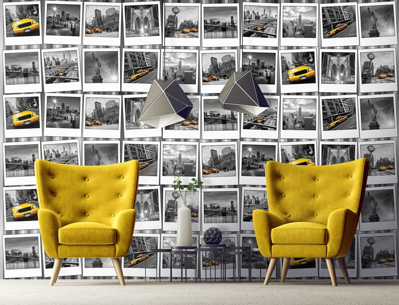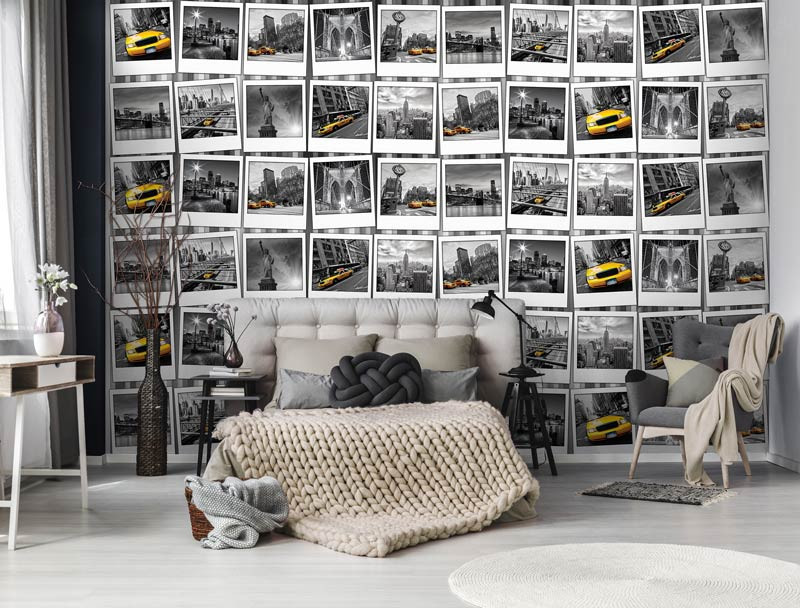 Vliestapete mit einer Fotocollage, die die Freiheitsstatue, das gelbe Taxi und alles, was mit der amerikanischen Metropole zu tun hat, zeigt.