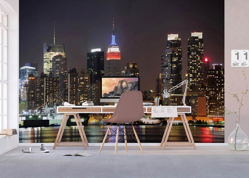 Spüren Sie die Energie der Stadt, die niemals schläft, mit dieser Fototapete der Skyline von New York bei Nacht. Die hell erleuchteten Gebäude vor dem dunklen Himmel schaffen eine dynamische und urbane Atmosphäre.