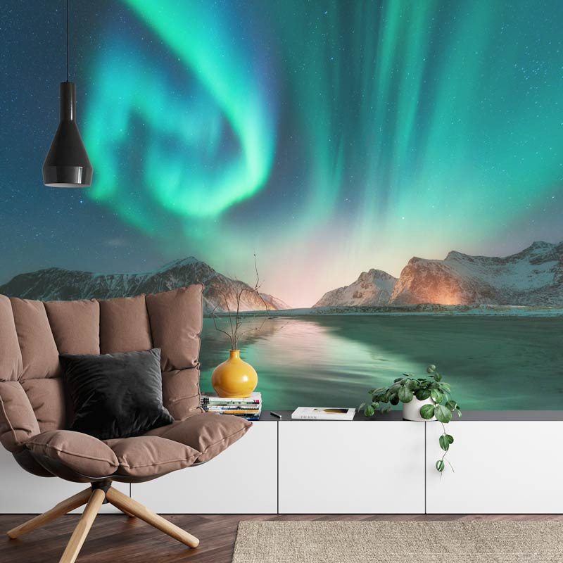 Lassen Sie sich von dem magischen Schauspiel der Nordlichter über den schneebedeckten Bergen und dem glitzernden See mit der Fototapete Nordlichter über den Bergen und dem See verzaubern. Tauchen Sie ein in eine Welt der Verzauberung und bewundern Sie die tanzenden Lichter am Nachthimmel.