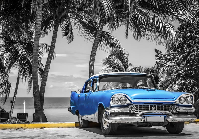 Fototapete mit einem wunderschönen alten blauen Auto vor Palmen und dem kubanischen Meer, gerendert im Retro-Look.