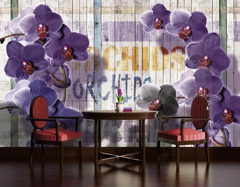 Vlies-Fototapete von schönen Orchideen auf einer schönen, hölzernen Wand.