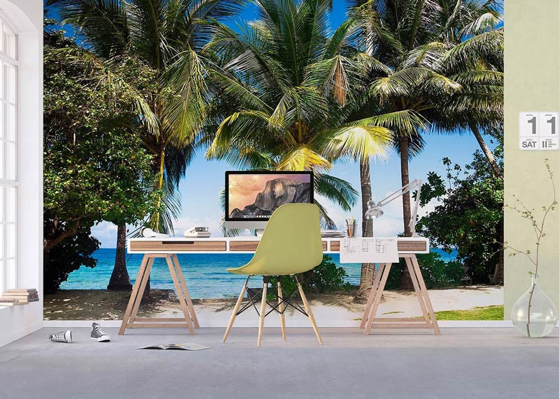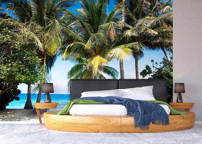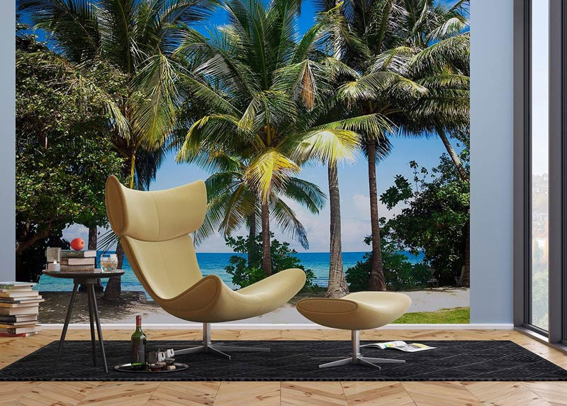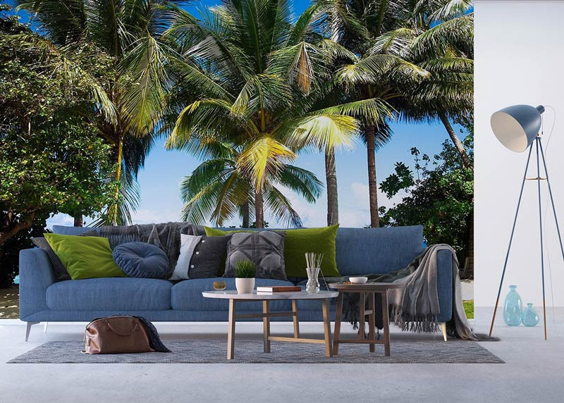 Schaffen Sie eine tropische Oase mit dieser Fototapete mit Palmen am Meer. Die blauen Farbtöne des Ozeans und das satte Grün der Palmen schaffen eine erfrischende, exotische Atmosphäre, die sich ideal für Wohn- oder Schlafzimmer eignet.
