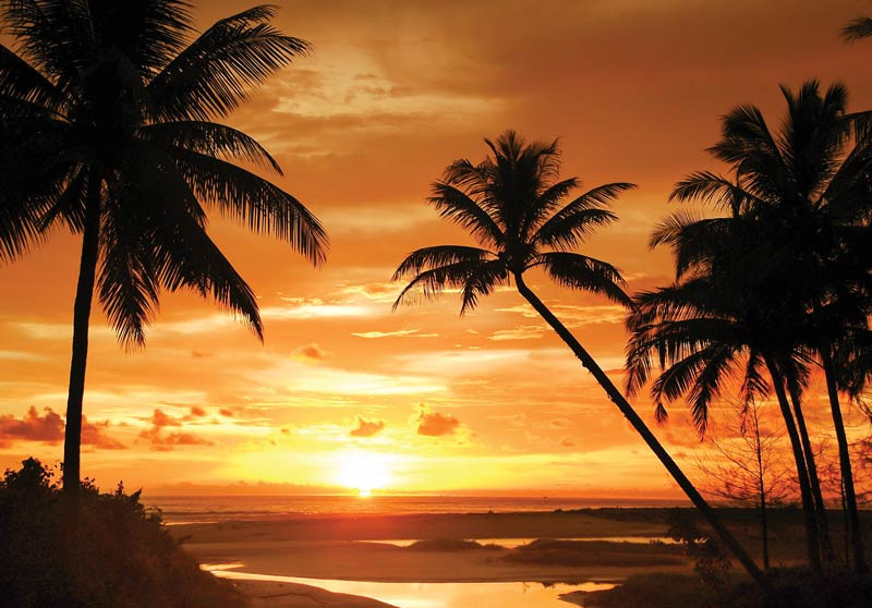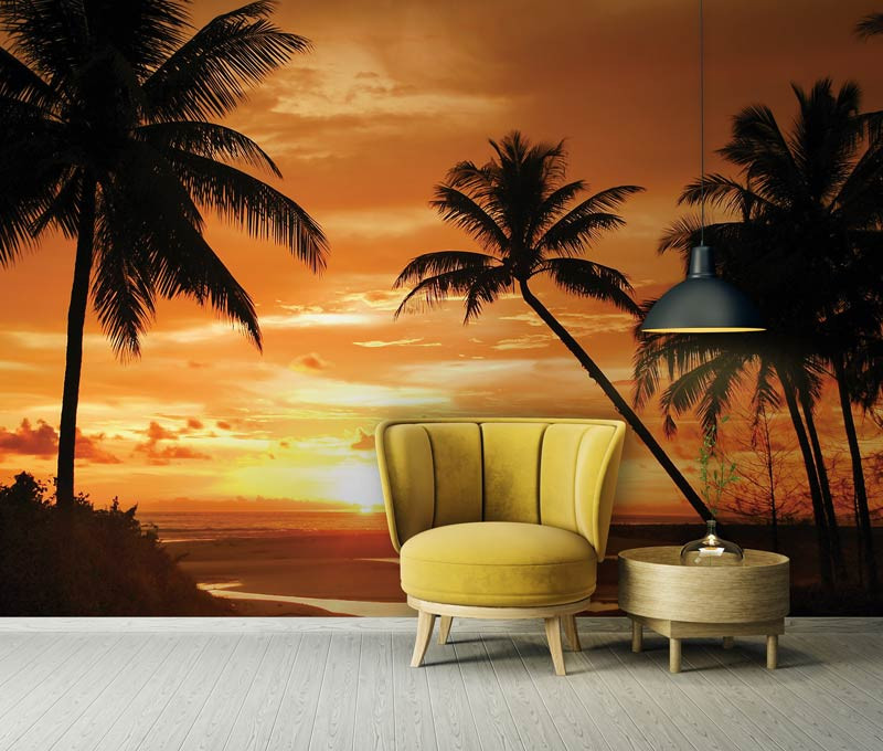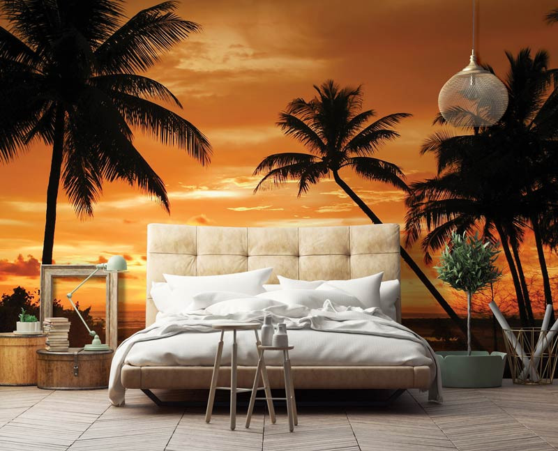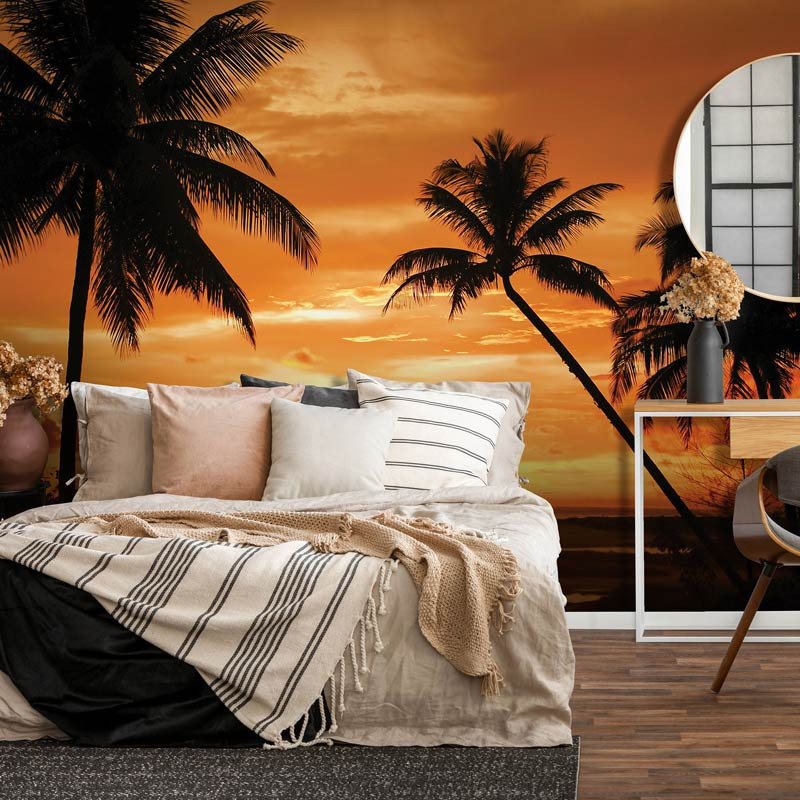 Vlies-Fototapete eines Paares von schönen Palmen im Licht des Sonnenuntergangs.