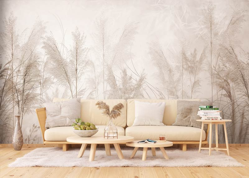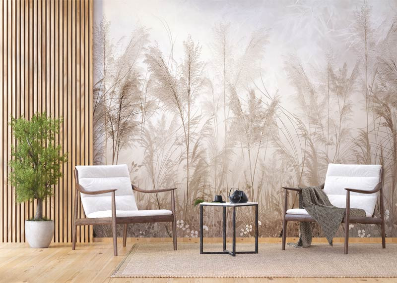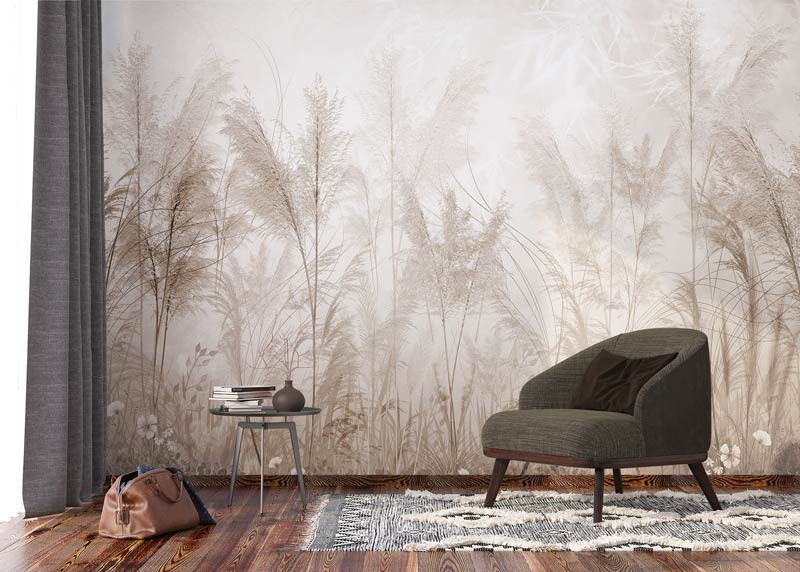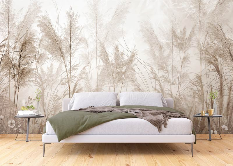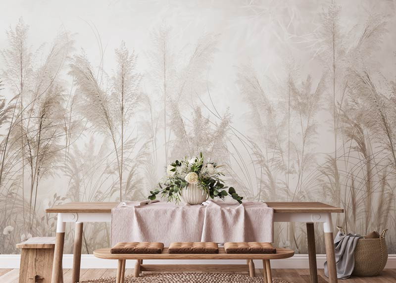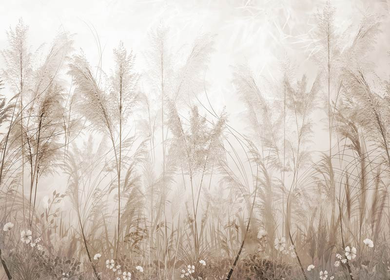 Verleihen Sie Ihrem Interieur mit der Fototapete Pampasgrass Garden ein natürliches und weiches Gefühl. Die anmutigen Büschel von Pampasgras in warmen Tönen schaffen eine ruhige, böhmische Atmosphäre, die perfekt zu einer modernen Einrichtung passt.