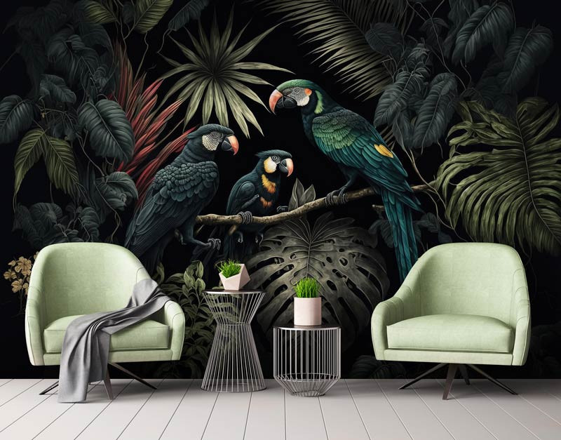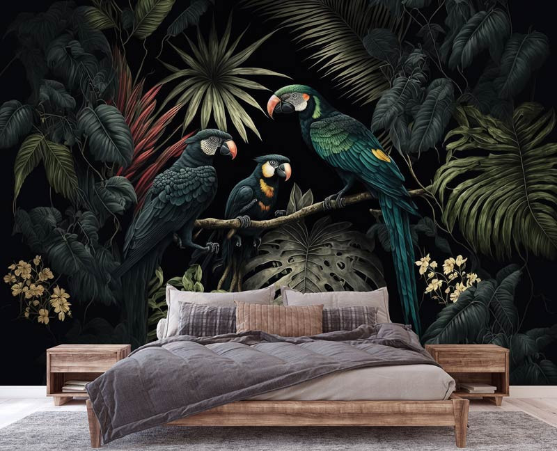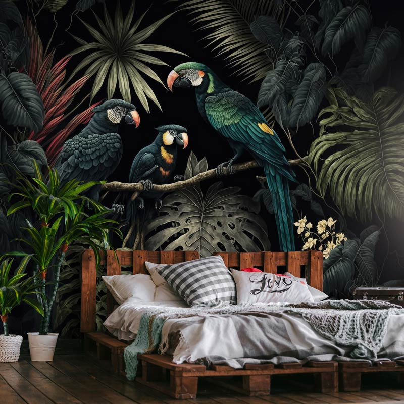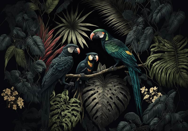 Holen Sie sich die tropische Atmosphäre in Ihr Zuhause mit dieser tropischen Dschungel-Fototapete mit Papageien. Die prächtigen Papageien in Kombination mit den üppigen, grünen Dschungelblättern schaffen eine tropische Oase in jedem Raum.
