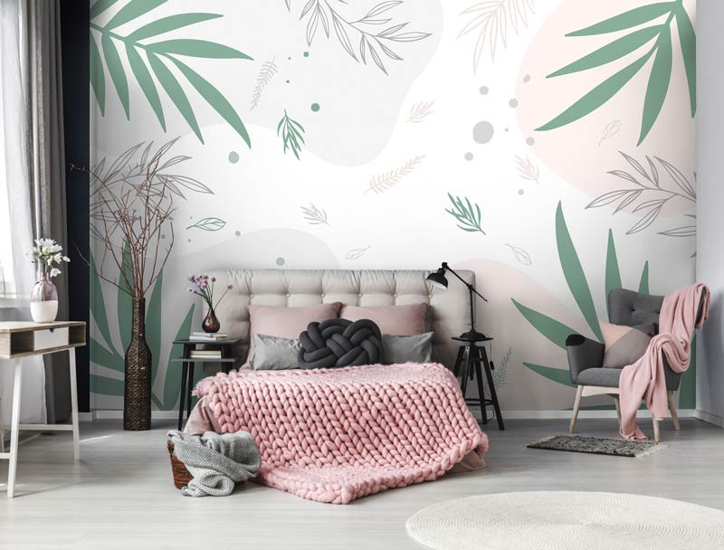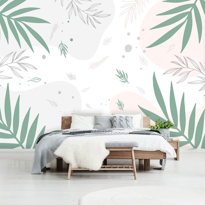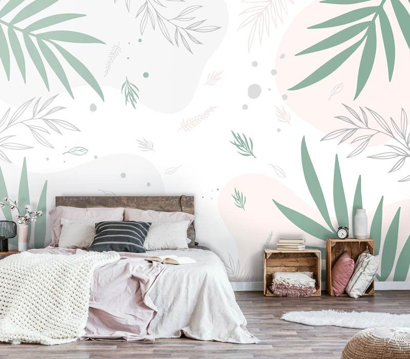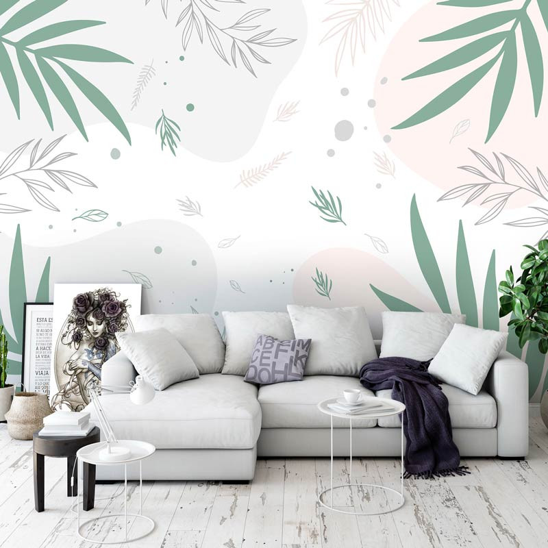 Fototapete pastellfarbene Blätter ist ein echter Blickfang im: Wohnzimmer, Schlafzimmer, Hobbyraum, Küche, Flur, Büro oder jedem anderen Raum.