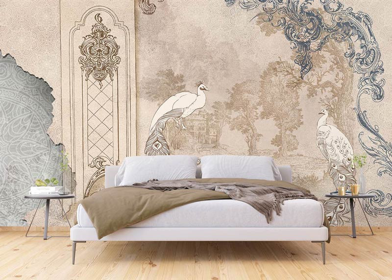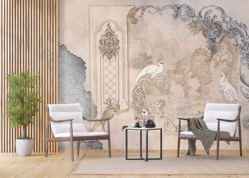 Verleihen Sie sich einen Hauch von Luxus mit dieser Fototapete mit Pfauen im Rokoko-Stil. Die leuchtenden Farben und detaillierten Muster verleihen ein Gefühl von Eleganz und Kunstfertigkeit. Diese individuell gestaltbare Tapete passt wunderbar in klassische und stilvolle Interieurs.