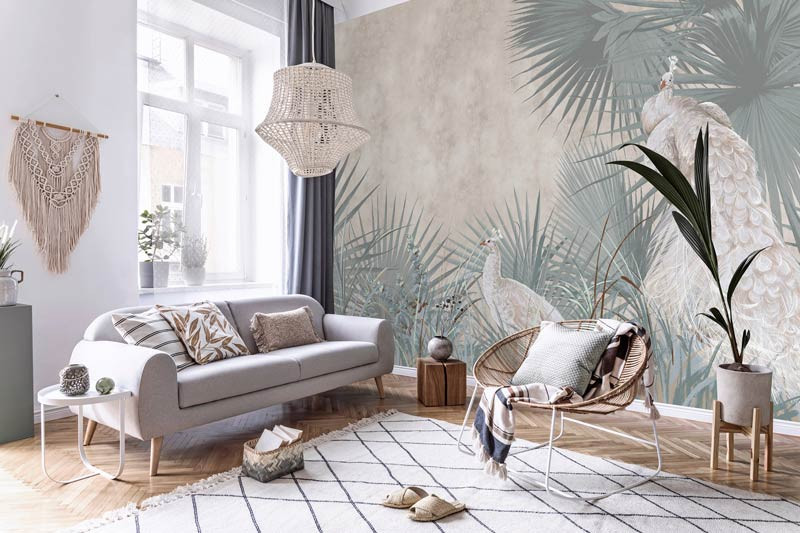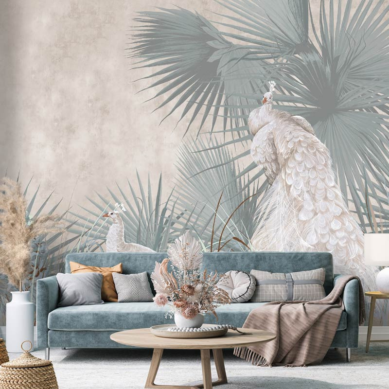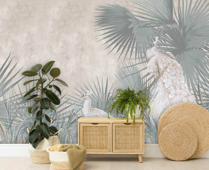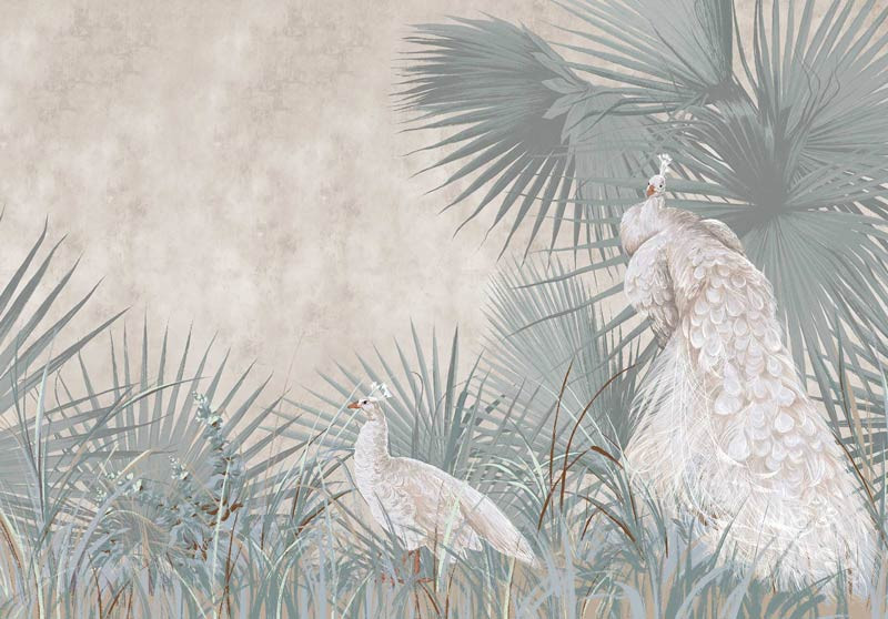 Holen Sie sich mit der Fototapete Peacocks in Tropical Oasis eine exotische Atmosphäre in Ihr Zuhause. Die leuchtenden Grüntöne der Blätter und die majestätischen Pfaue schaffen eine Oase der Ruhe und des Luxus. Diese Tapete ist ideal für alle, die ihren Innenräumen einen einzigartigen und tropischen Look verleihen möchten.