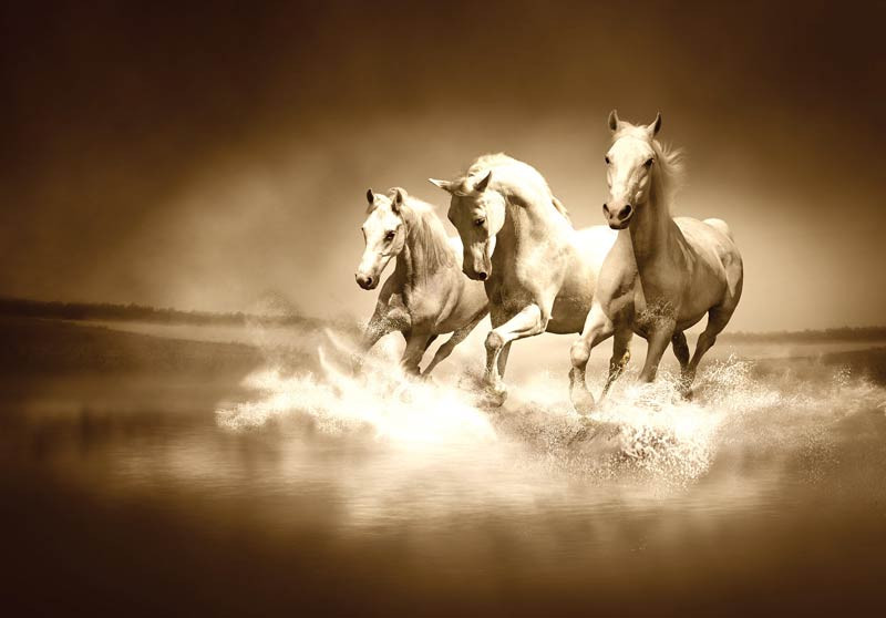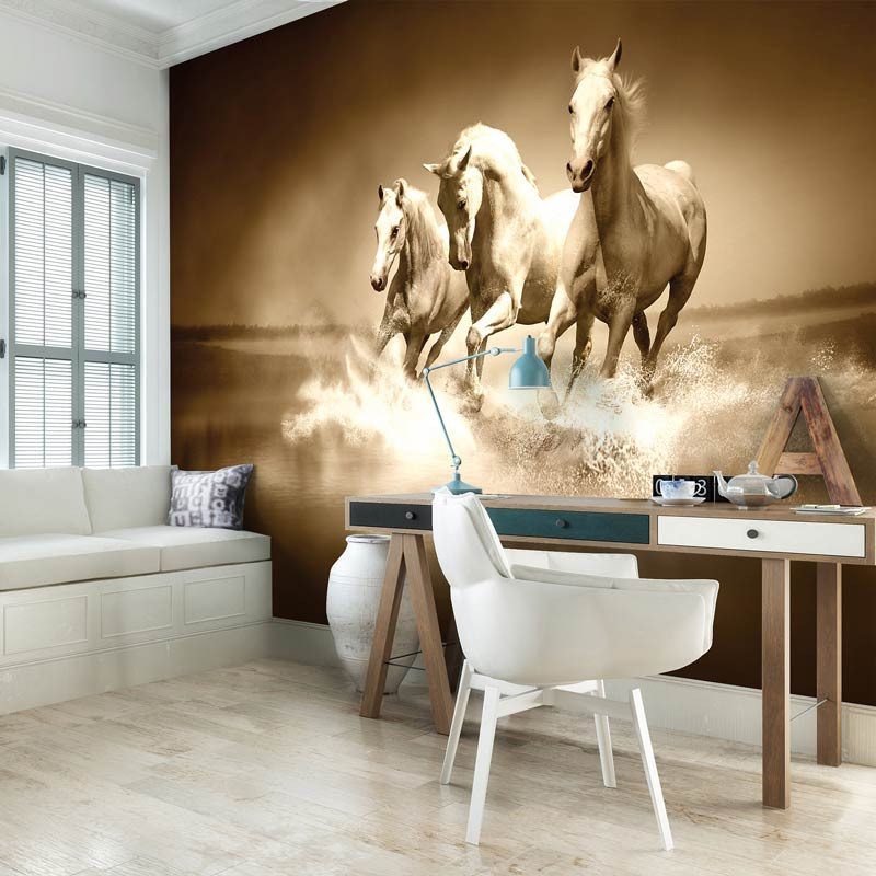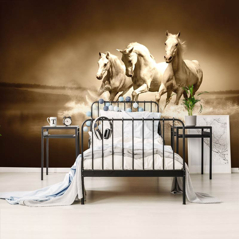 Fototapete von 3 schönen galoppierenden, weißen Pferden im Wasser.